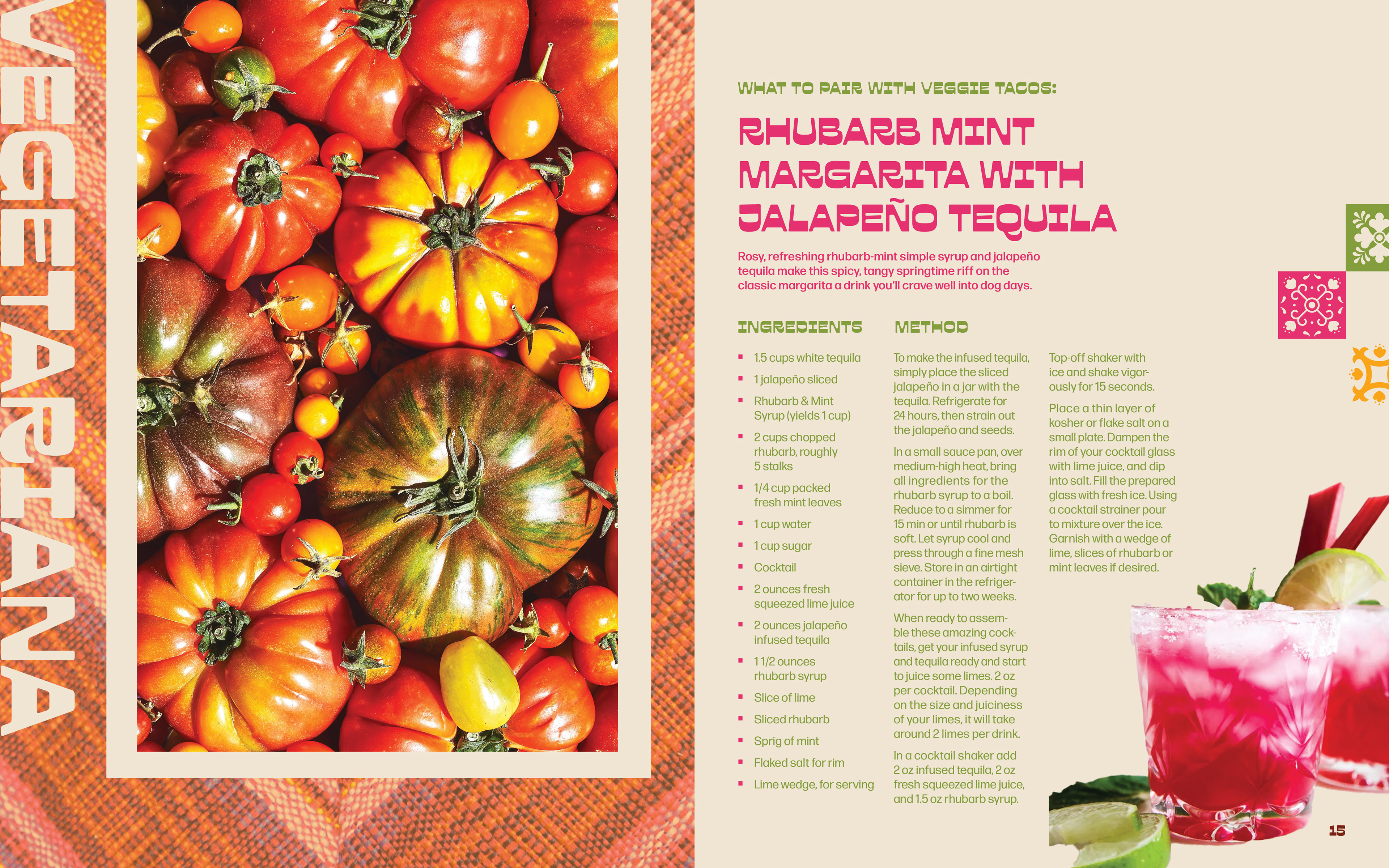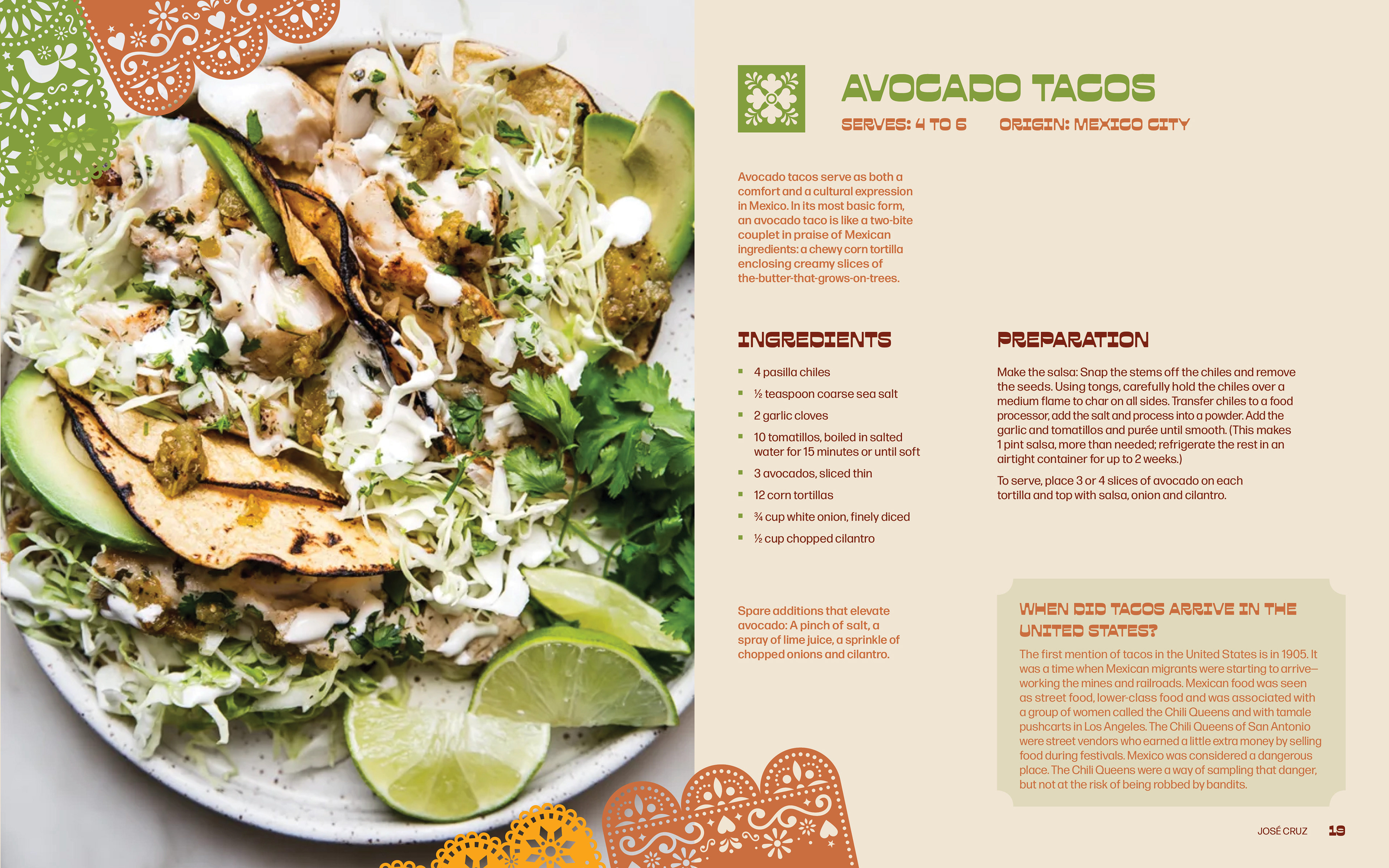 I decided to take the project a step further and source more recipes to fill the pages (courtesy of The Modern Proper). I took inspiration from the vibrant colours, messy ingredients, and bold flavours of Mexican street tacos.