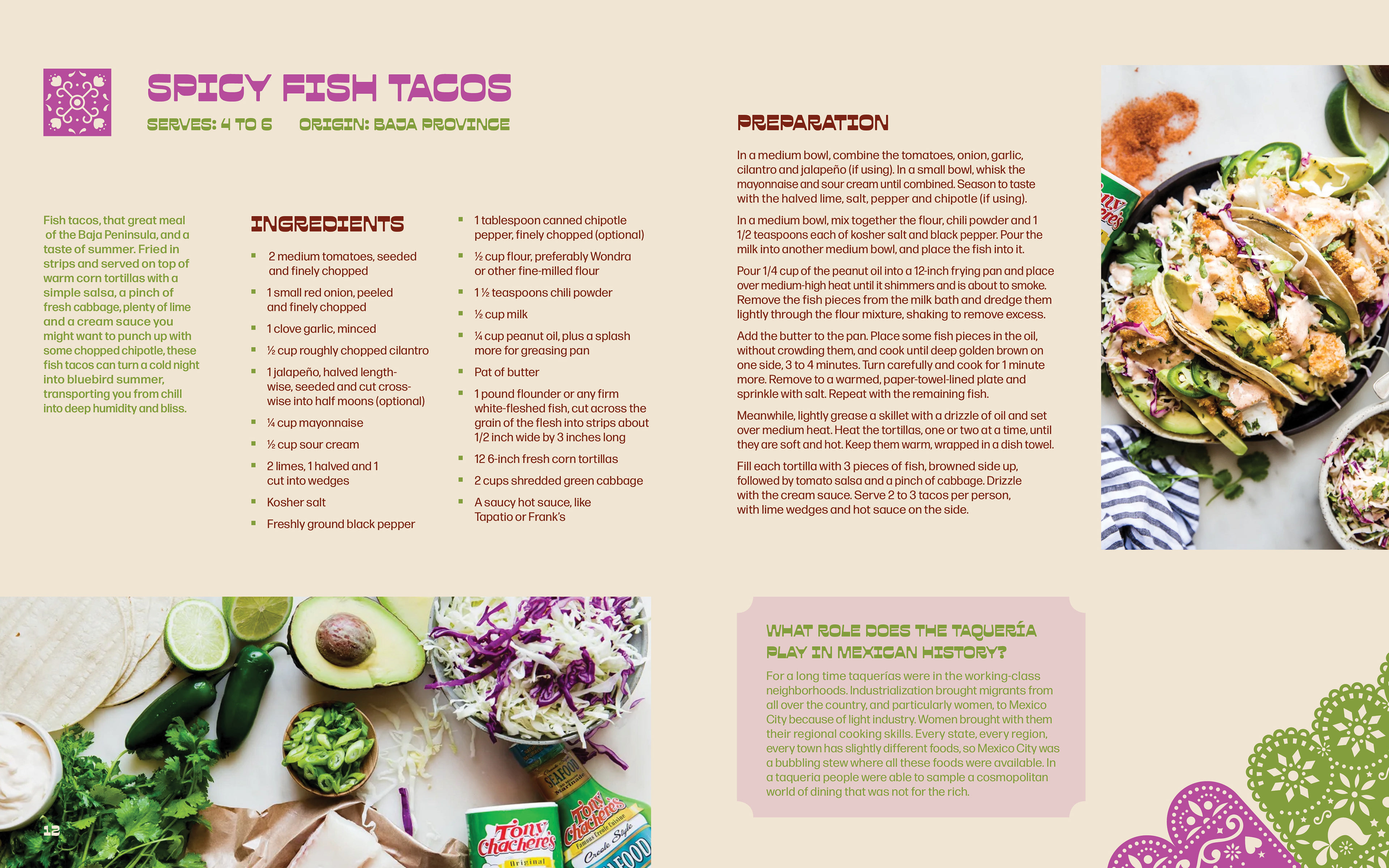 For this typography project, my goal was to make a cookbook that represents aspects of traditional Mexican culture while also pushing my own creative boundaries. I wanted to pay tribute to the Mexican heritage and the family history associated with the recipes provided, so I chose to include imagery of papel picado (paper banners), and Mexican tiles. The colour palette is inspired by the vibrant dresses of Mexican folklórico dancers and the colourful ingredients in tacos themselves.
